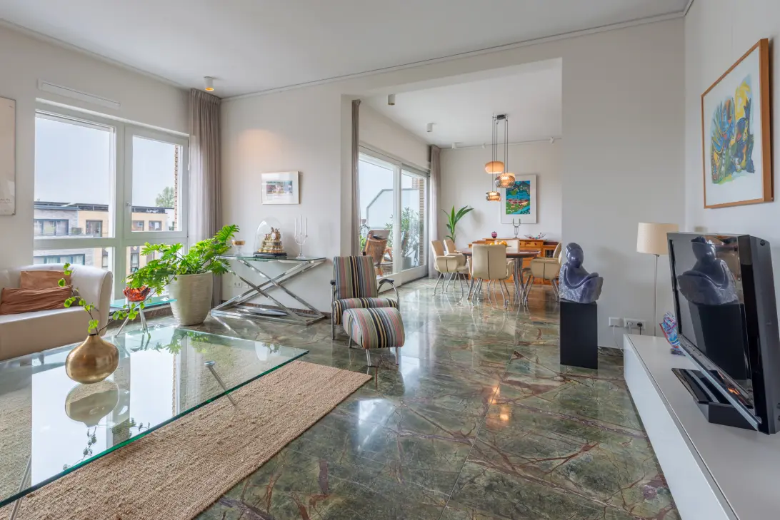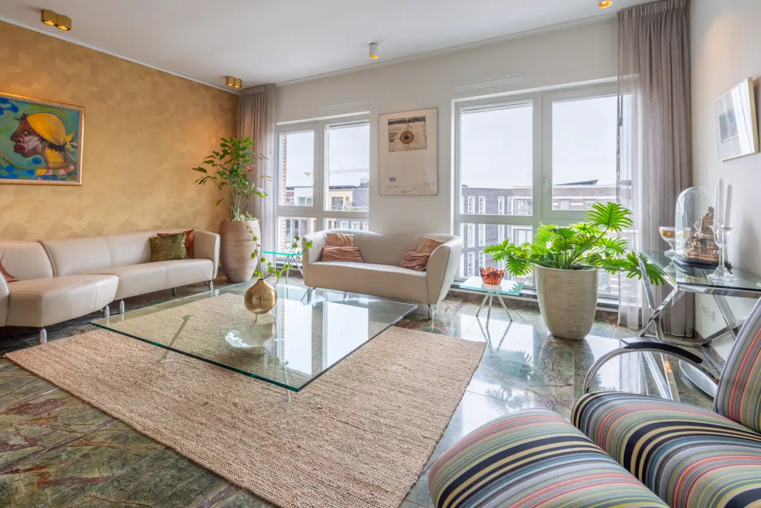 Met uw persoonlijke tag in de lift komt u op de afgesloten privéhal van de bovenste verdieping. Hier ligt dit lichte en zeer royale penthouse van 144 m² met twee balkons en een wijds uitzicht – onder andere op de iconische Pontsteiger. Het appartement is in 2020 opgeleverd en gebouwd volgens de hoogste duurzaamheidsstandaarden: energielabel A+, vloerverwarming & -koeling en 9 zonnepanelen. Verder beschikt u over twee slaapkamers, twee badkamers, een ruime woonkeuken en een inpandige berging.