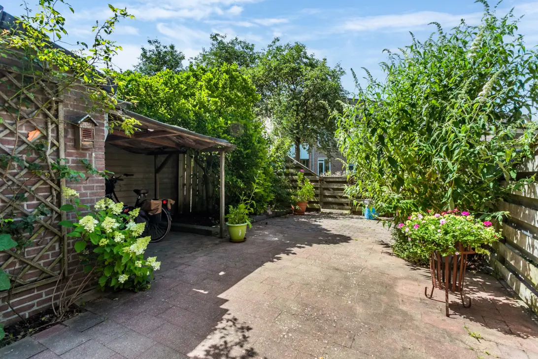 Indeling: entree, hal, toilet met fonteintje, ruime zonnige woonkamer met aan de tuinzijde de open keuken voorzien van diverse inbouwapparatuur, bijkeuken met toegangsdeur naar de tuin. In de tuin op het zuidwesten kan je de hele middag en avond in alle privacy genieten van de zon. De tuin is groen aangelegd en een heeft een achterom naar een hofje met speeltoestellen, dus echt ideaal voor kinderen.