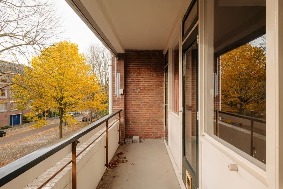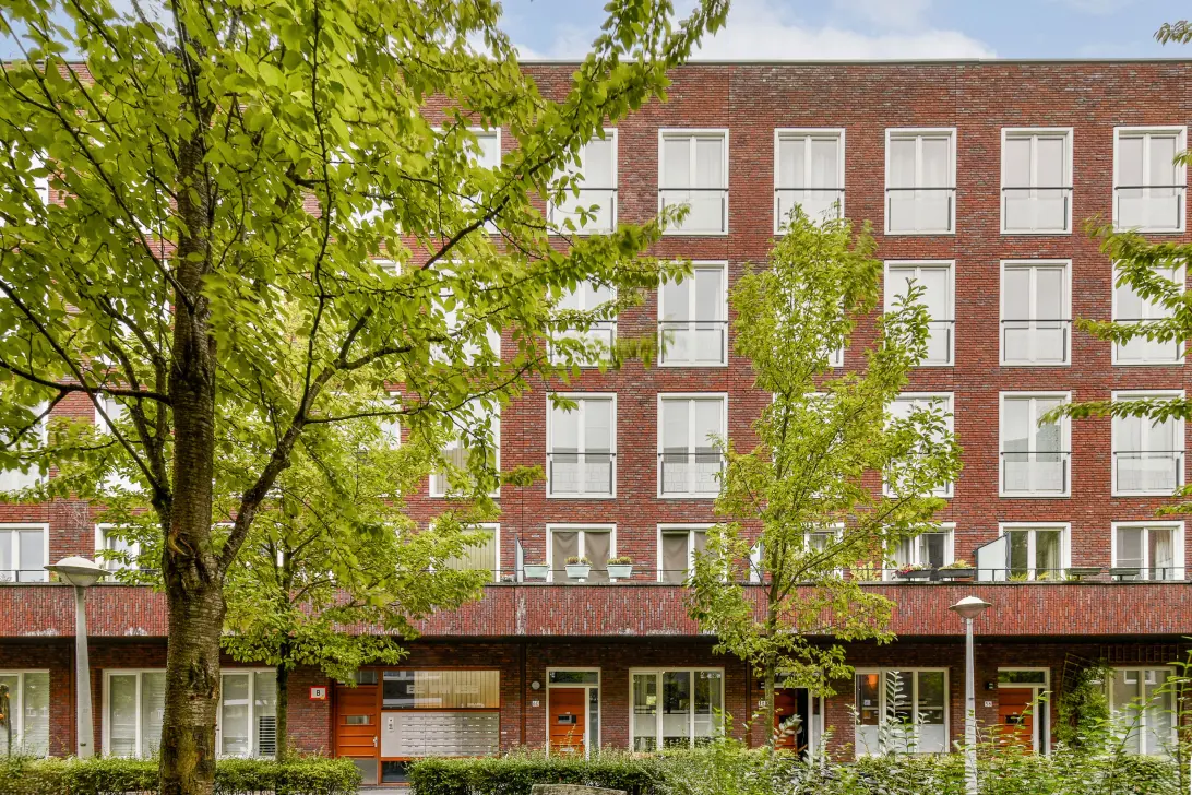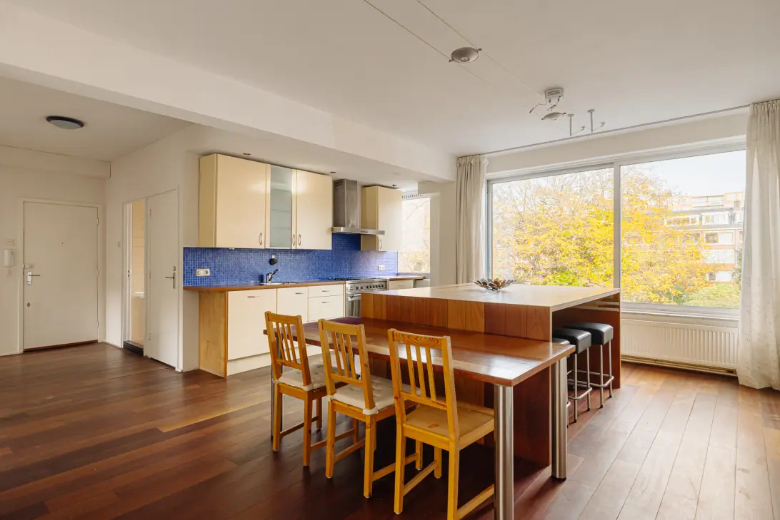 Rietnesse 3 II is a bright and logically arranged nineteen-sixties apartment in Buitenveldert, featuring a continuous living and kitchen area that feels open thanks to large windows on both sides. The kitchen, finished with wooden accents and blue tiles, forms a natural connection with the living room. At the rear are two bedrooms with access to a south-facing balcony. The bathroom and kitchen are positioned at the front. Additional attic space suitable for a home office or guest room — and a private storage room on the ground floor add to the home’s functionality. Despite its current energy label G, a sustainability plan for the entire building is already in preparation. The location in green, well-connected Buitenveldert offers tranquillity while remaining close to amenities, public transport and the Zuidas.