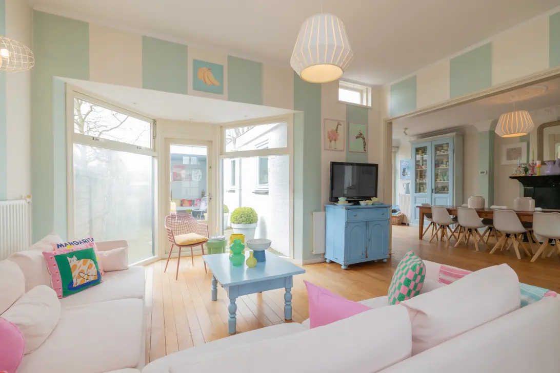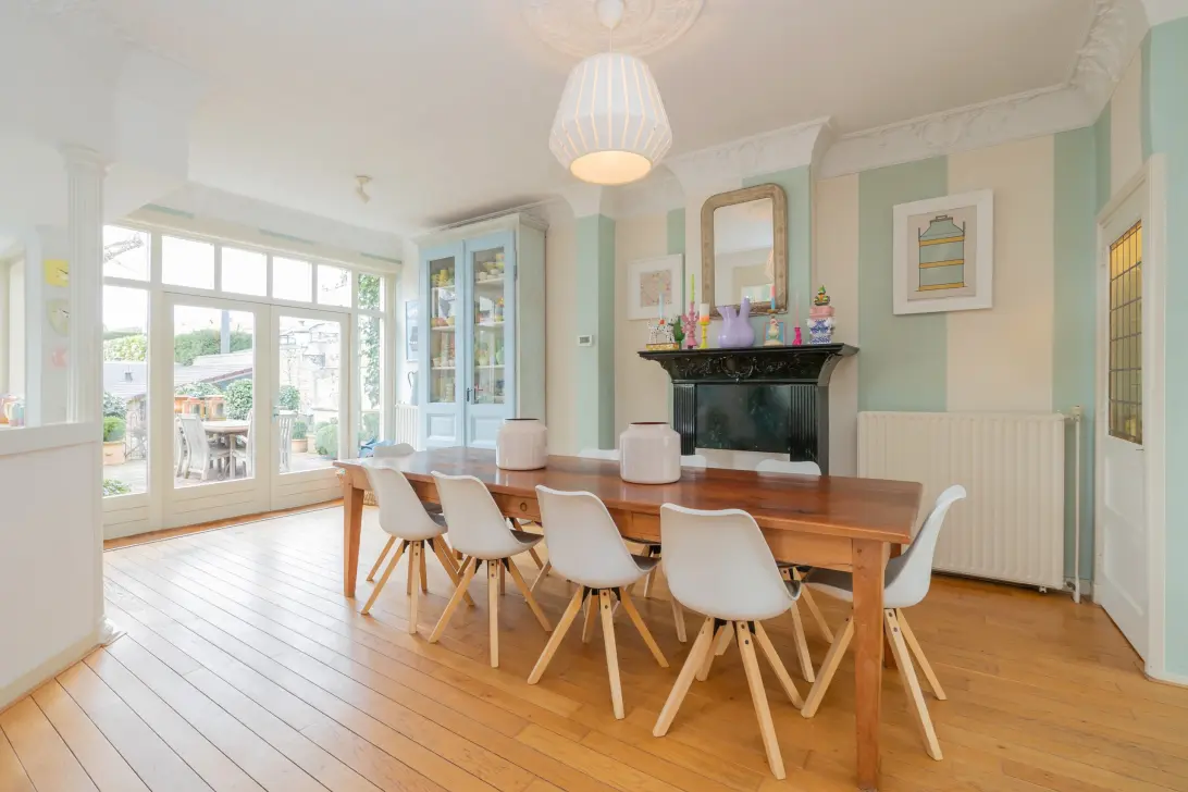 De bijzonder brede woonkamer met erker ligt aan de achterzijde en biedt uitzicht over de privacyvolle achtertuin. Aan de achterzijde zijn de keuken en bijkeuken bij elkaar getrokken, waardoor er een ruime open keuken is gerealiseerd met extra ramen voor nog meer licht. Op de eerste verdieping beschikt dit heerlijke familiehuis over vier slaapkamers, een wasruimte en een (slaap)vide. De wasruimte was voorheen een badkamer, dus deze ruimte leent zich uitstekend om tot tweede badkamer omgebouwd te worden. Daarnaast zit er nog een loze ruimte naast de vide, welke in gebruik genomen zou kunnen worden als bergvliering.