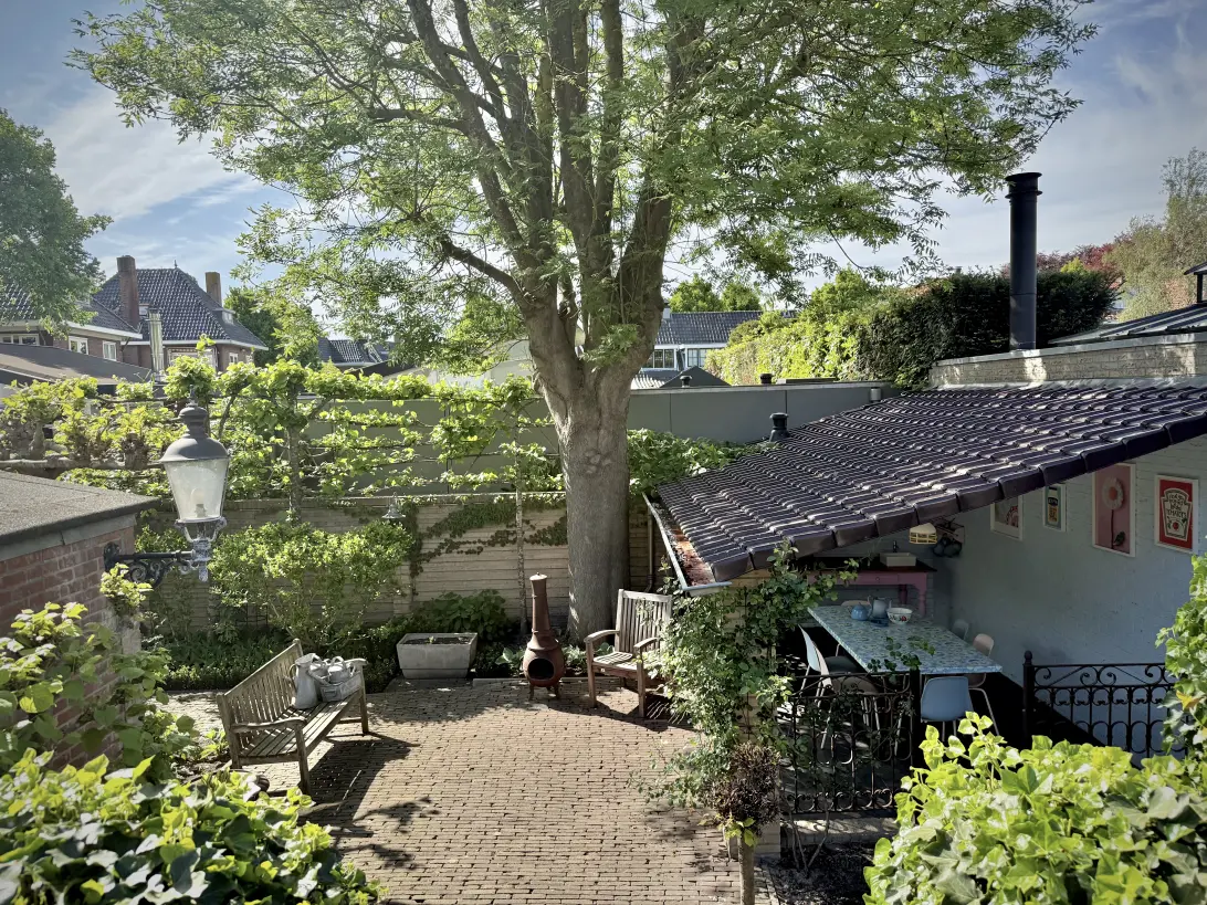 * Zonnige achtertuin met sfeervolle overkapping/veranda en voormalige schuur omgebouwd tot leuke zithoek met overkapping