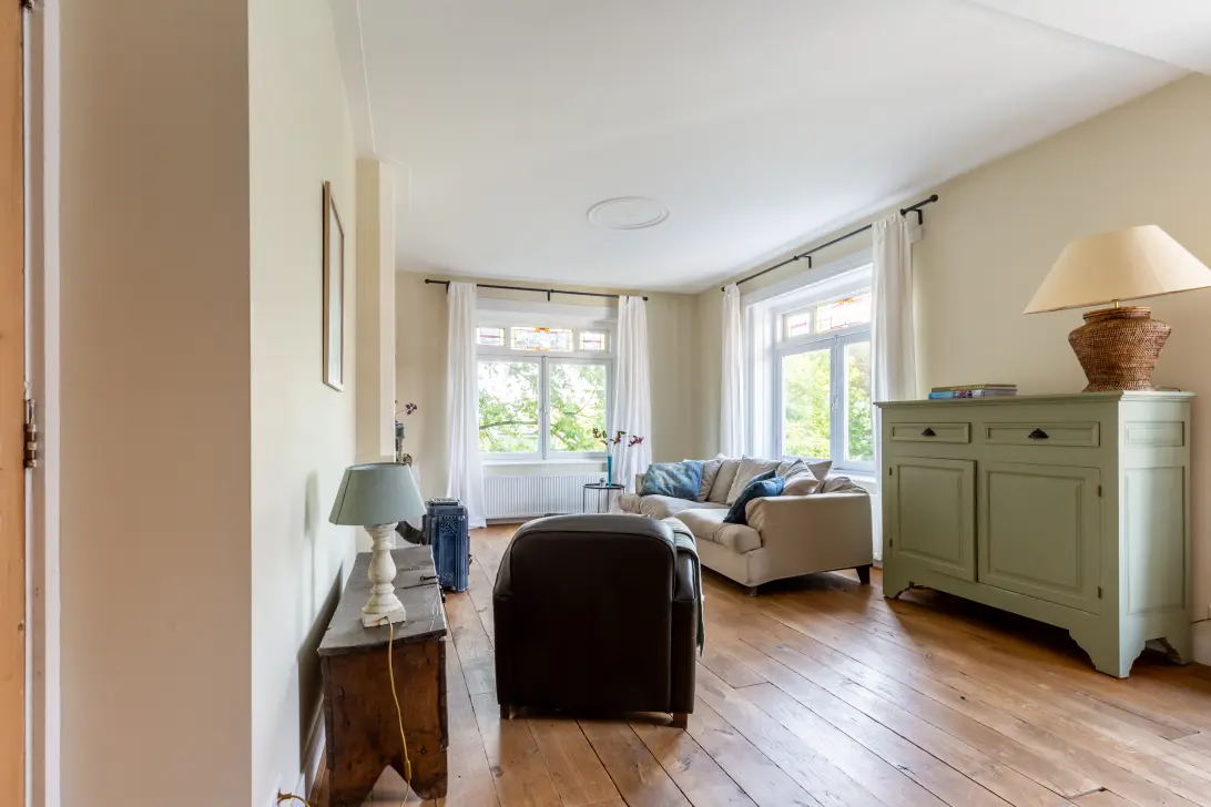 LICHT en sfeervol hoekappartement met glas-in-lood details, twee slaapkamers, ruime berging (inpandig en zolderkamer) en gelegen op eigen grond!