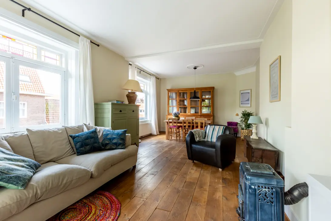 Via het gemeenschappelijke trappenhuis bereikt u de entree op de derde verdieping. De hoekligging zorgt voor veel lichtinval in de woonkamer en keuken. De woonkamer is sfeervol door de glas-in-lood bovenlichten. De keuken is voorzien van o.a. een vaatwasser en een vrijstaand rvs oven/gasfornuis met 5 pitten.