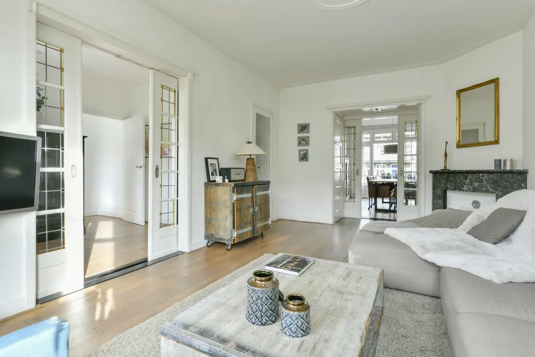 Je komt de woning binnen in de centraal gelegen, L-vormige gang met garderobenisje. De woonkamer aan de voorzijde is voorzien van een karakteristieke erker, natuurstenen schouw en diepe inbouwkasten. Bijzonder aan deze kamer is dat er een dubbele en-suite constructie is; één naar de achterkamer en één naar de kamer opzij. Middels twee separate, originele glas-in-lood schuifdeuren worden de drie kamers met elkaar verbonden.