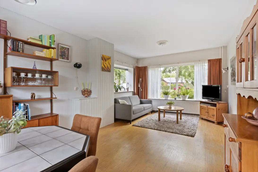 De woonkamer is heerlijk licht door de grote ramen. Dat geeft direct een ruim gevoel. Daarnaast kijk je zeer leuk uit over de Rijperweg. Ook is er meer dan voldoende ruimte voor een gezellige eethoek.