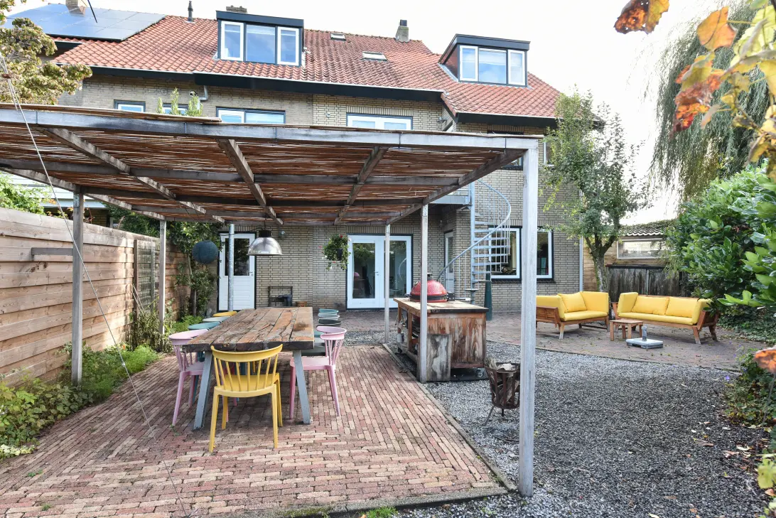 In de achtertuin zit je heerlijk beschut en hier is een houten berging te vinden. Op een zonnige dag heb je veel plezier van de met natuurlijke materialen afgewerkte overkapping.