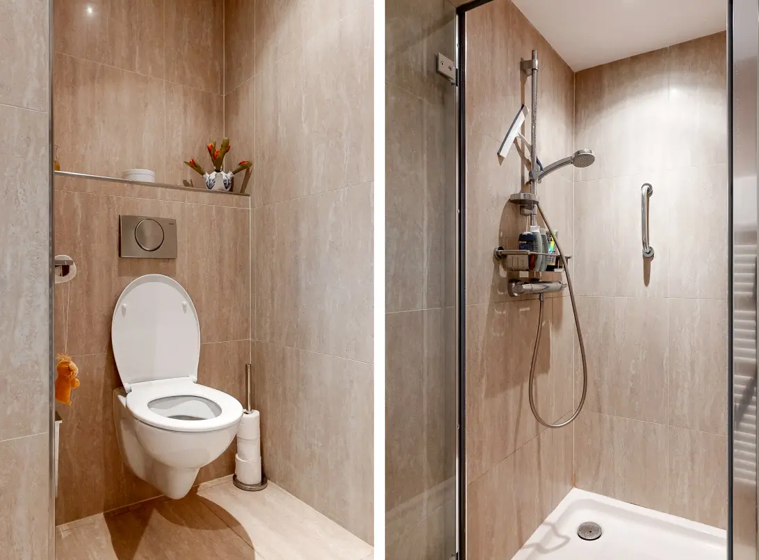 Op de verdieping is wellicht de grootste verrassing. Standaard waren hier drie ruime slaapkamer, twee badkamers en een derde toilet, maar nu is op de eerste verdieping een ruime woonunit ontstaan met een eigen keuken en een complete badkamer met ligbad, inloopdouche, toilet en wastafelmeubel.