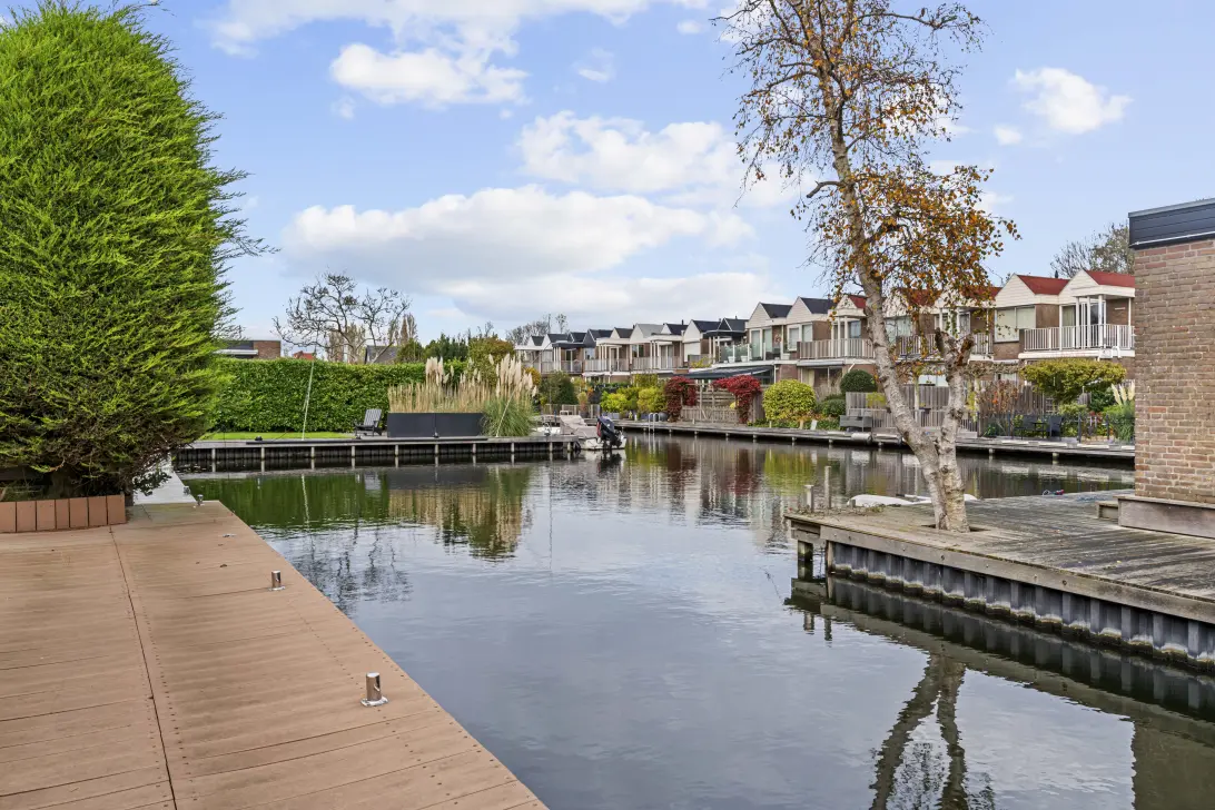 De achtertuin heeft een beschutte ligging op het oosten met een privé steiger voor de aan te leggen sloep en heeft u uitzicht over de havenkom die uitkomt op de Ringvaart.