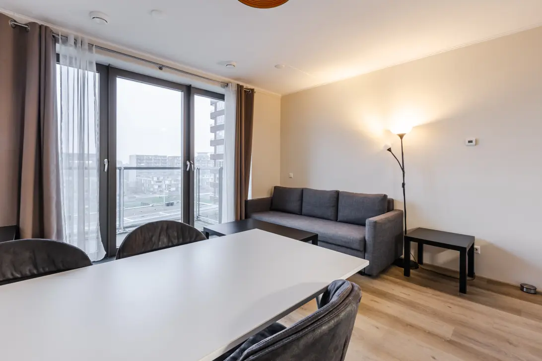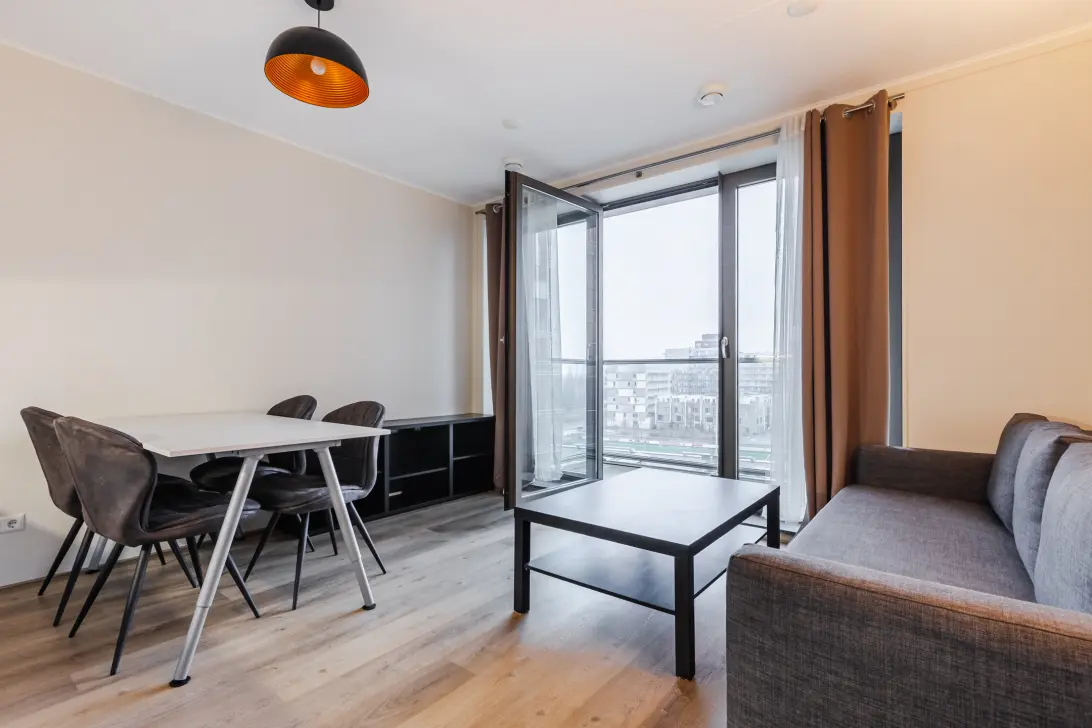 The bright living room has a door leading to the balcony and is connected to the open kitchen. The kitchen is neatly finished and equipped with, among other things, an oven, dishwasher, induction hob and fridge with freezer compartment.