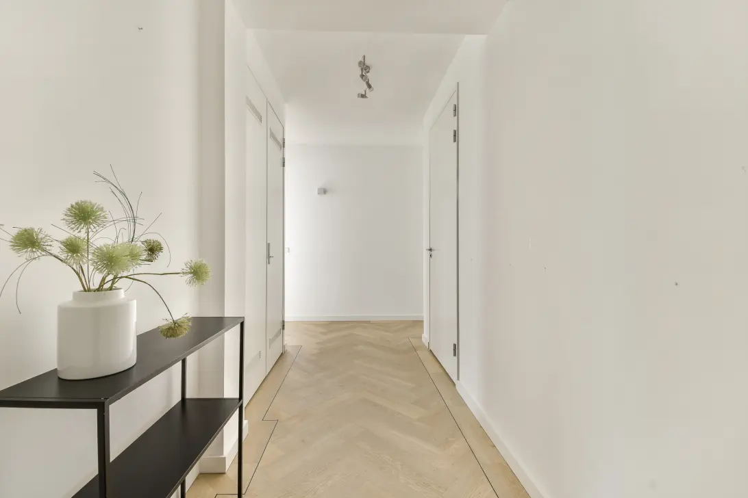 The apartment is located on the seventh floor via a communal entrance with mailboxes, the staircase, and two elevators. The first thing you'll notice about the apartment is the beautiful PVC herringbone floor that connects the entire apartment. The spacious hallway features a wardrobe and a separate toilet with a hand basin. The hallway provides access to all rooms. As soon as you enter the living room, you're enveloped in natural light, which, thanks to its corner location, enters from two sides. The beautiful wooden shutters create an inviting atmosphere. This spacious room offers ample space for a comfortable seating and dining area. The west-facing terrace extends from the living room.