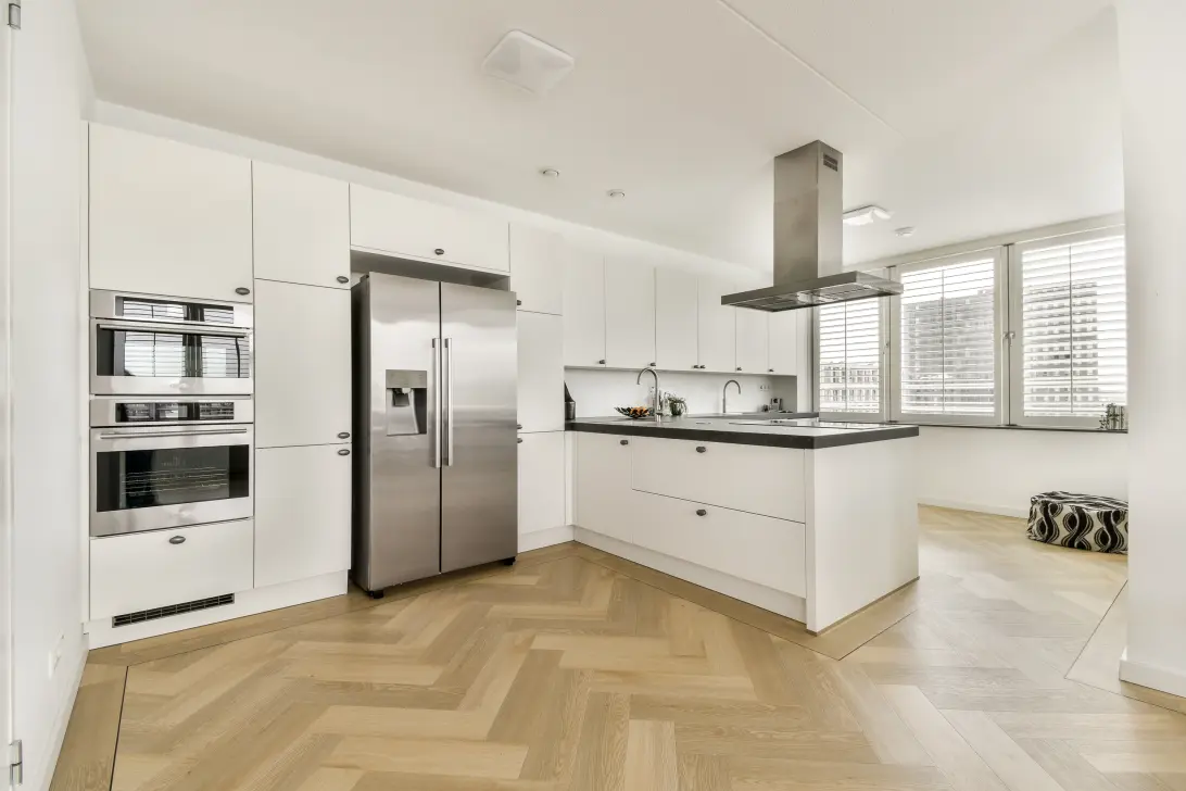 The modern, luxurious open-plan kitchen with a semi-island completes the picture and is a dream for any cooking enthusiast. It offers ample work and storage space, as well as all the necessary high-quality built-in appliances, including a Quooker (hot, cold, and sparkling), an induction cooktop with extractor hood, an American-style refrigerator, two cooling drawers, a dual-function English dishwasher, a built-in combination microwave, and an oven.