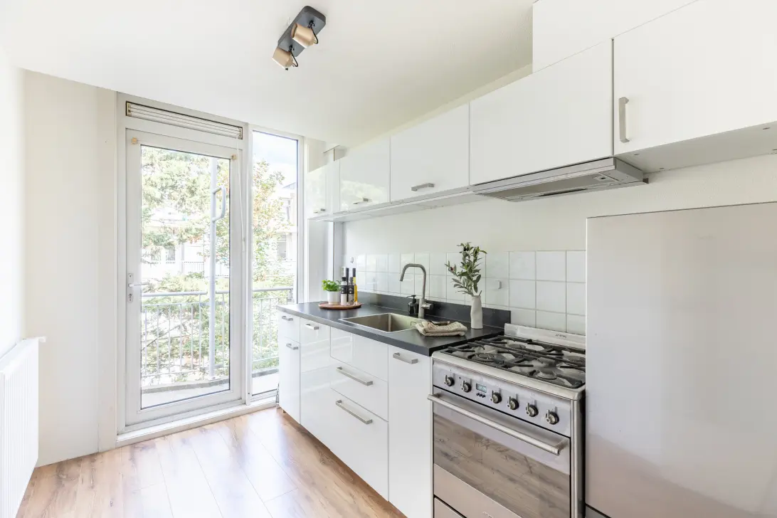 De woning beschikt over een lichte woonkamer, een aparte keuken (2023) met inbouwvaatwasser en afzuigkap, een ruime slaapkamer met plek voor een groot bed, kledingkast en bureau, en een balkon.