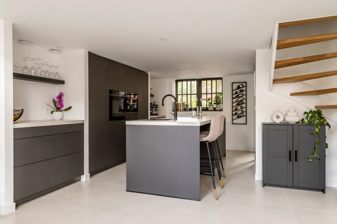 Ground floor: unobstructed location at the front, entrance with meter cupboard, storage cupboard and modern toilet with washbasin, glass door to spacious kitchen (2024) with built-in appliances (Miele, Siemens and Quooker) and bar. The spacious living room with a ceiling height of more than 4.5 metres has large windows overlooking the cosy west-facing garden, which is also accessible via French doors and has a back entrance.
