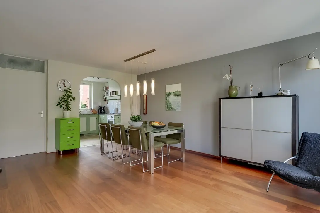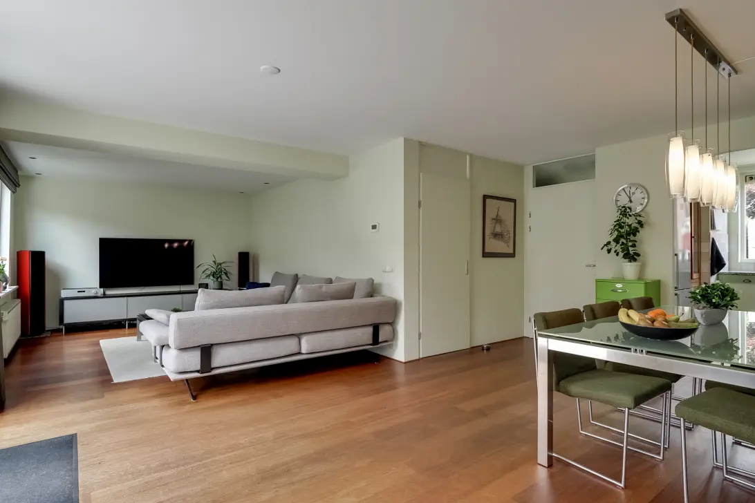 Aan de achterzijde van de woning is het woongedeelte gesitueerd. De voormalige garage is voor een gedeelte bij de woonkamer betrokken, hierdoor is een ruime eet- en zithoek gecreëerd. De ramen, alsmede openslaande tuindeuren zorgen voor een mooie verbinding tussen de woonkamer en de tuin. De begane grond is voorzien van een hardhouten vloer, wat zorgt voor een sfeervol geheel.