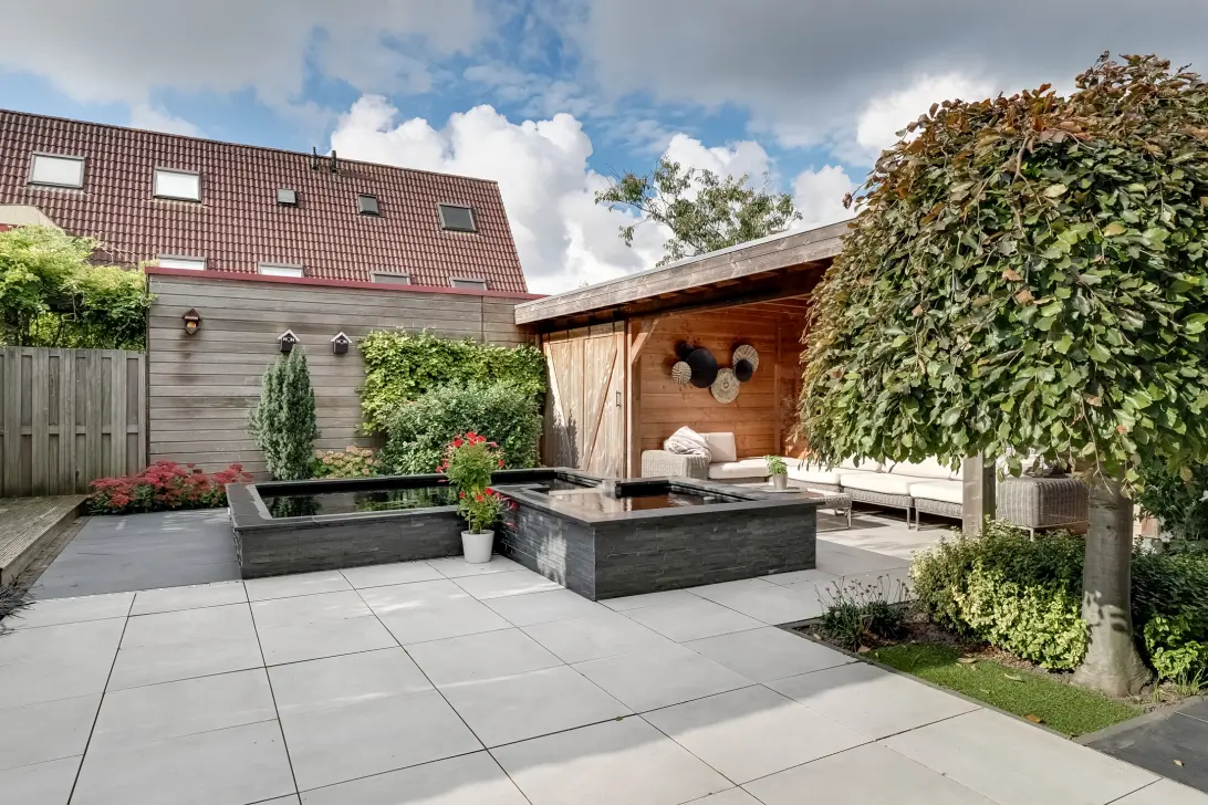 De verzorgde achtertuin, welke bereikbaar is middels dubbele tuindeuren, is voorzien van fraaie sierbestrating, groenborders, Koivijver (overname van de vissen mogelijk) en een praktische berging met overkapping en achterom. Een fijne plek om in alle rust buiten te zitten, te tuinieren of met een groot gezelschap te genieten. De zonnige ligging maakt dat de bewoners aan de woning een zonnescherm hebben geplaatst.