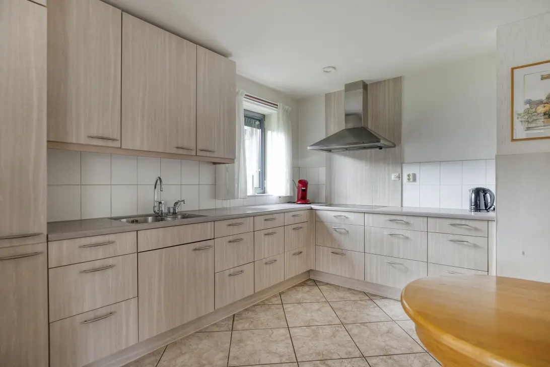 De ruime keuken is voorzien van een koelkast en vriezer en bied veel opbergruimte. In het midden is plaats genoeg voor een eettafel. Daarnaast vindt u in de praktische bijkeuken een wasmachineaansluiting en voldoende ruimte om ook een droger en een extra vriezer te plaatsen.