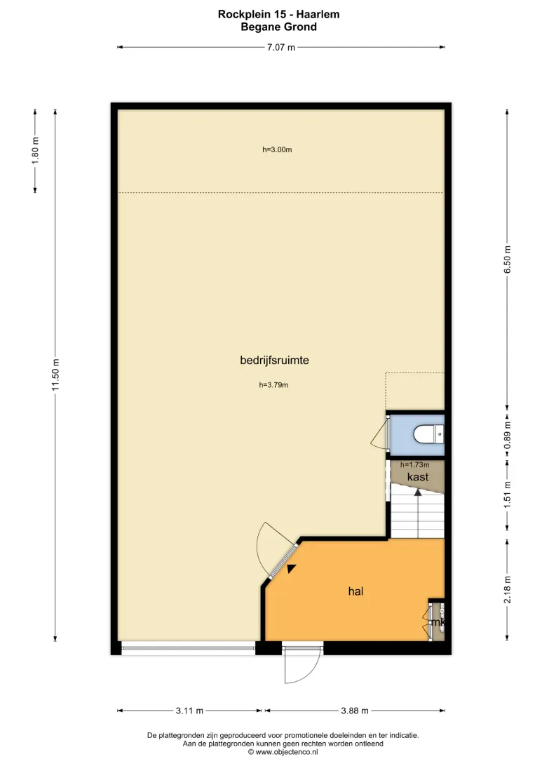 Parterre bedrijfsruimte: voorterrein met eigen parkeerplaats; via centrale entree/hal en via overheaddeur te bereiken bedrijfshal van ca. 11.50 meter diep, inrijbreedte van ca. 3.11 meter en een plafondhoogte van maar liefst 3.79 meter!; toilet en bergkast.
