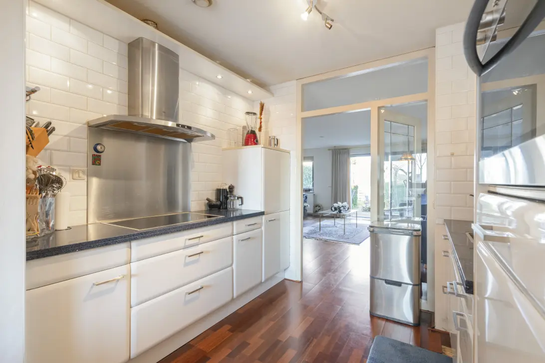 De woning beschikt over een grote, lichte woonkamer die via een schuifpui naadloos overgaat in de achtertuin, binnen en buiten vloeien hier prettig in elkaar over. De separate keuken met eetkamer biedt de ideale plek om rustig te koken en samen aan tafel te zitten, zonder dat de drukte van de keuken de woonkamer bereikt. Een praktische en gezellige indeling voor het hele gezin.