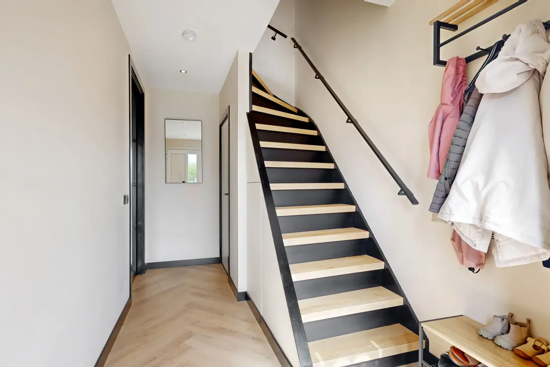 Op de eerste verdieping bevinden zich drie goed bemeten slaapkamers en een moderne badkamer met inloopdouche, toilet en wastafelmeubel. Ook deze verdieping is voorzien van vloerverwarming.