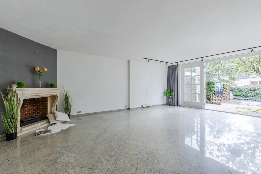 Upon arrival, the solid brick façade immediately stands out. Through the entrance hall—with modern fuse box, wall-mounted toilet, and staircase to the first floor—you enter the very spacious living room. At the front is a large kitchen equipped with various built-in appliances. The living room is generous, featuring a gas fireplace, granite floor with underfloor heating, and a glass rear façade that lets in plenty of natural light while offering a great view of the garden.