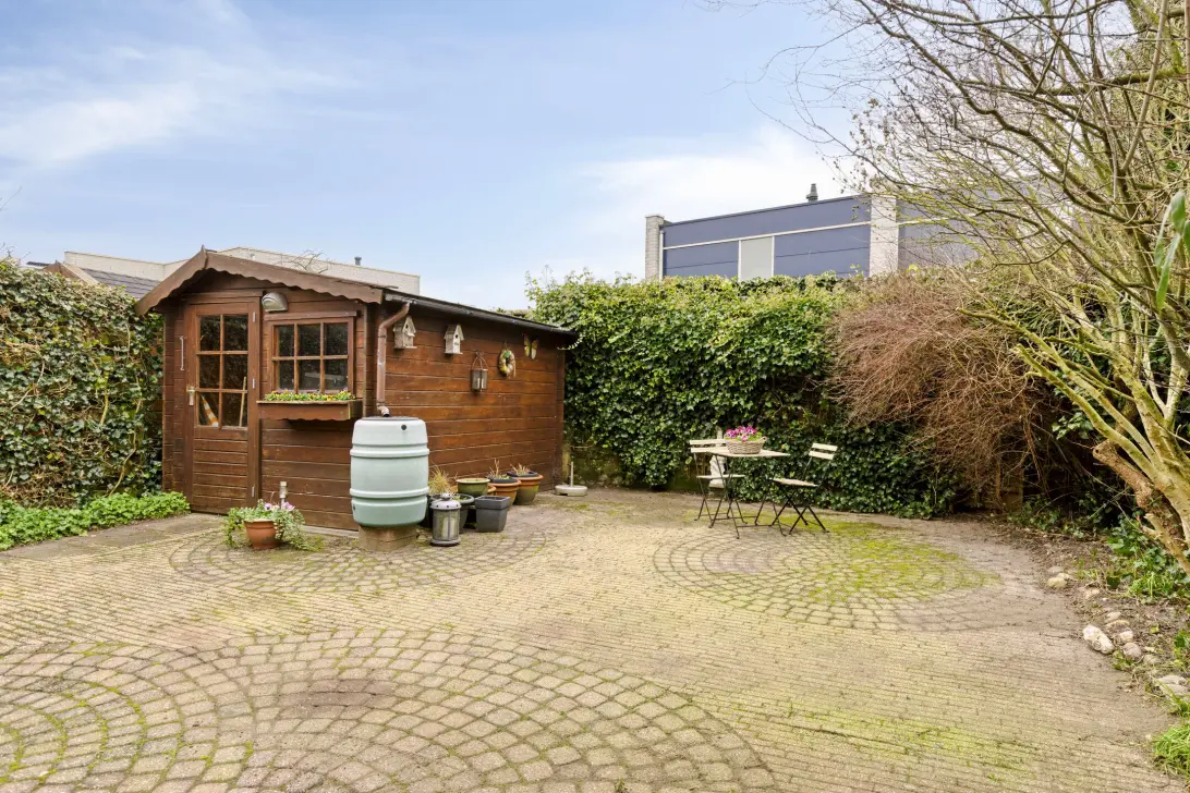 De zonnige achtertuin is gelegen op het westen en biedt voldoende ruimte voor een terras, speelgelegenheid of een comfortabele zit. Bovendien heb je hier veel privacy. Achterin de tuin bevindt zich een praktische berging, ideaal voor fietsen en tuingereedschap.