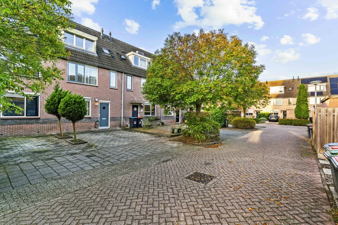 De voortuin is ingericht met klinkers en groene perken met bomen. Ook is er ruimte om jouw auto op eigen terrein te parkeren.