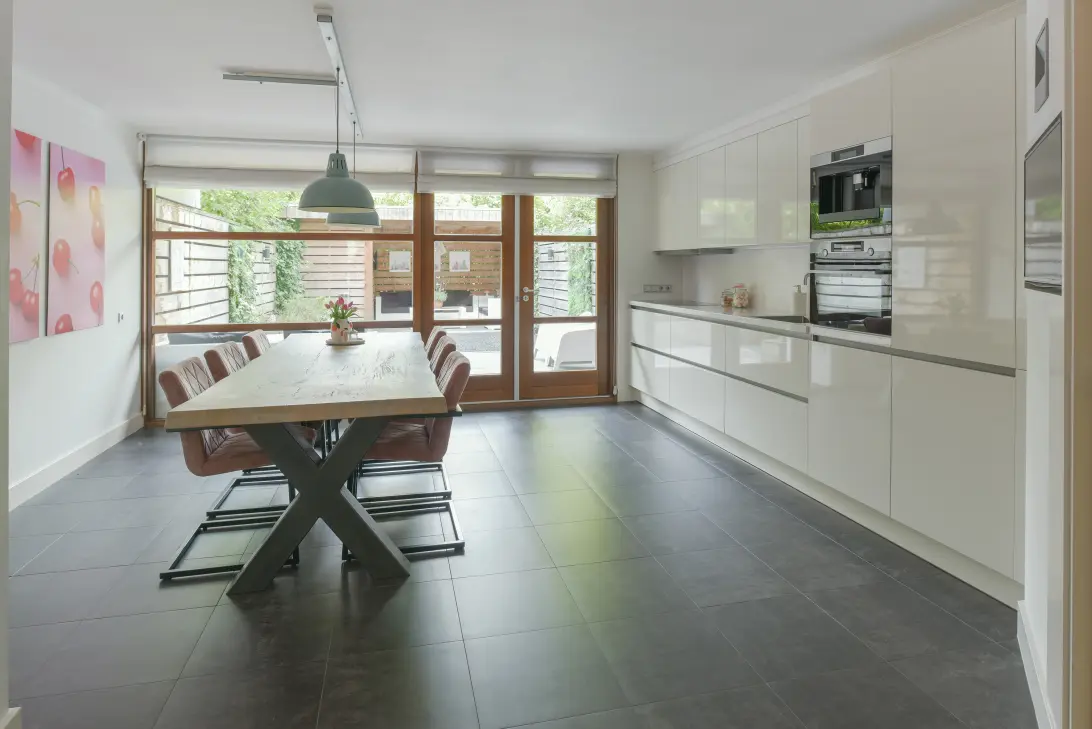 De keuken (2019) staat aan de rechterzijde en heeft een moderne uitstraling. De fronten zijn greeploos en je hebt veel ruimte om je spullen op te bergen. Een grote eettafel past met gemak naast de keuken.