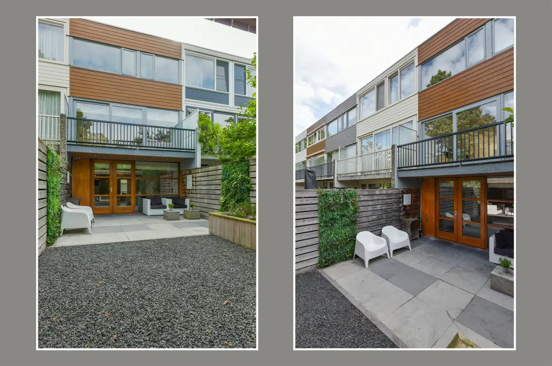Via de openslaande deuren op de begane grond kom je in de met smaak aangelegde achtertuin. Wat een fijne plek om van het mooie weer te genieten. Het terras is grotendeels betegeld en wordt afgewisseld met grind. De hippe veranda met televisie-aansluiting zorgt voor beschutting op een warme dag.