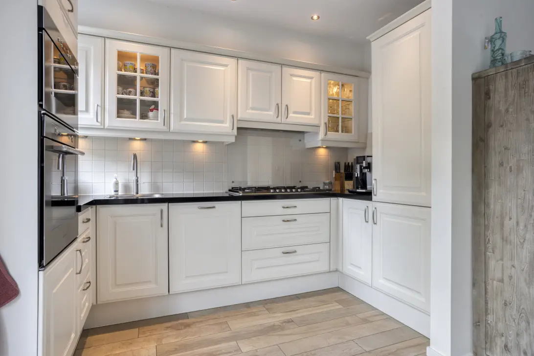De oorspronkelijke scheidingswand met de keuken is weggehaald, waardoor er een heerlijke ruime open keuken is gecreëerd. Het moderne keukenblok heeft een U-opstelling is voorzien van alle benodigde inbouwapparatuur (koelkast/vriezer, gaskooplaat, afzuigkap, oven, combi-magnetron, vaatwasser, quooker).