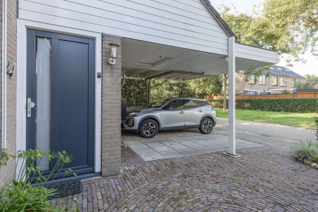 Bij aankomst valt meteen de verzorgde voortuin en de carport op, waardoor je altijd comfortabel kunt parkeren.