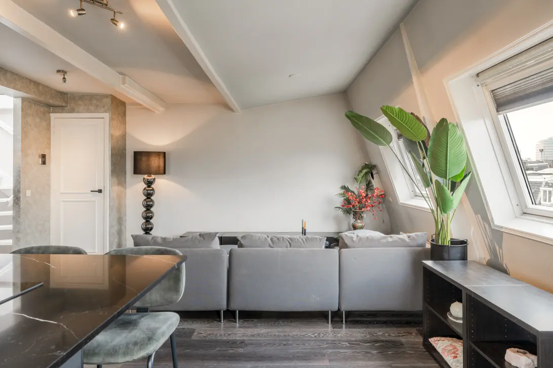 Stylish corner apartment of approximately 80 m² with a sunny private roof terrace and two generous bedrooms.
