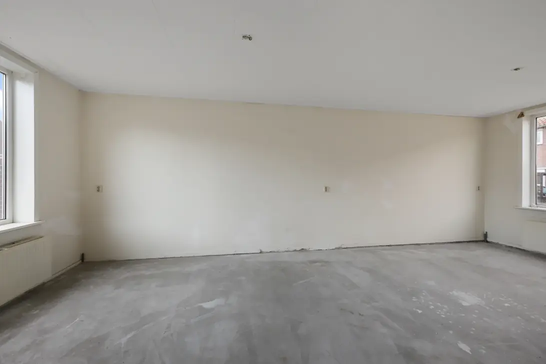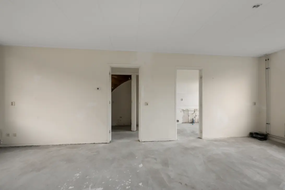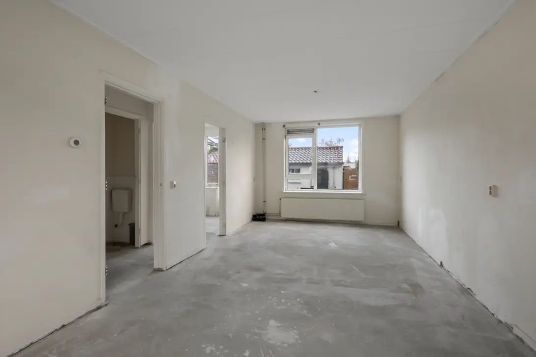 Laten we binnen een kijkje nemen. Via de hal betreden we de woning en komen we in de ruime doorzonwoonkamer. Dankzij de raampartijen aan zowel de voor- als achterzijde geniet deze ruimte van een prettige lichtinval gedurende de hele dag. De woonkamer vormt een fijne basis die geheel naar eigen wens is in te richten: van moderne leefruimte tot een warme, sfeervolle zithoek. Aan de achterzijde bevindt zich de keuken, die volledig naar eigen smaak te plaatsen is. Juist dit biedt een mooie kans om hier een keuken te realiseren die volledig aansluit bij jouw woonwensen — van strak en modern tot landelijk of industrieel.
