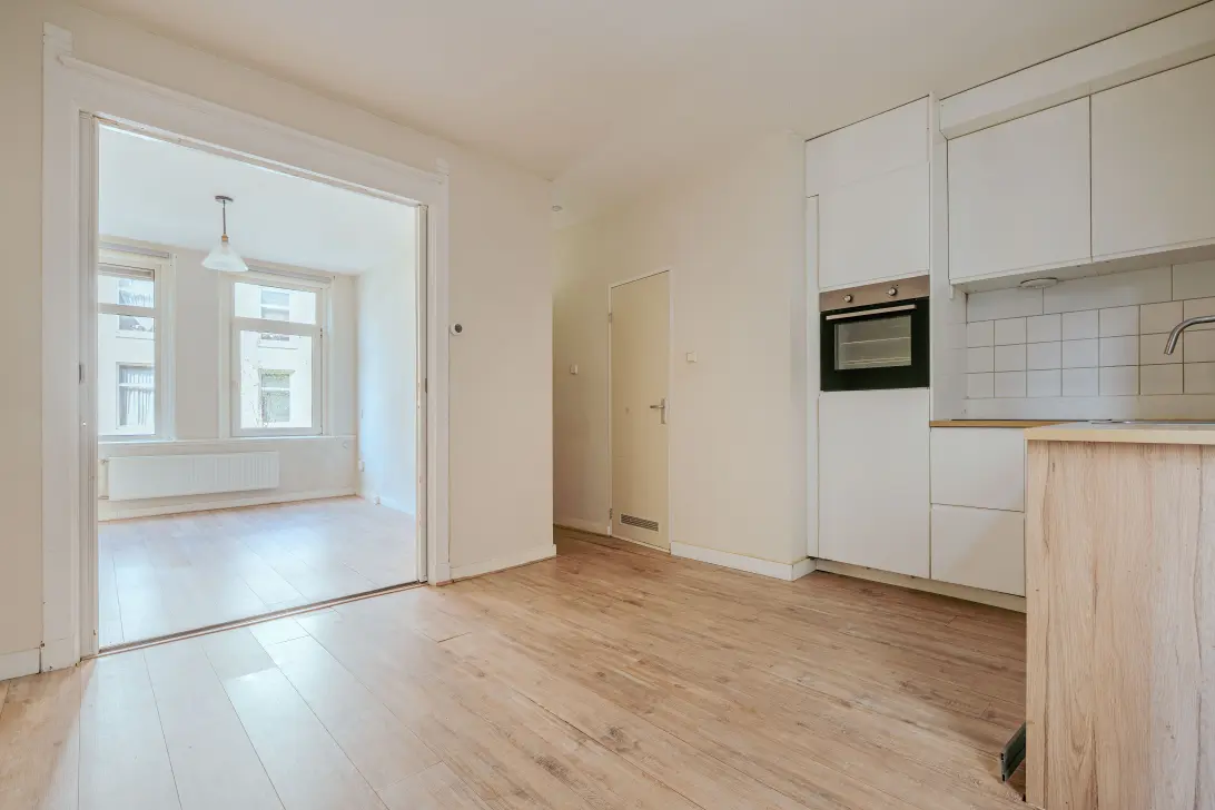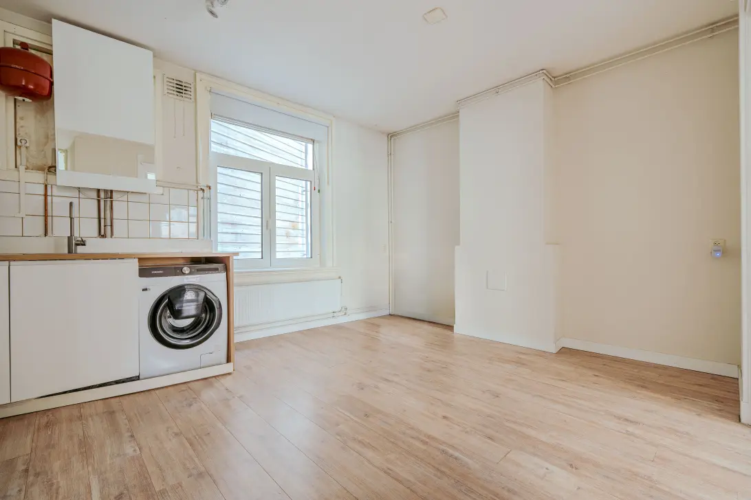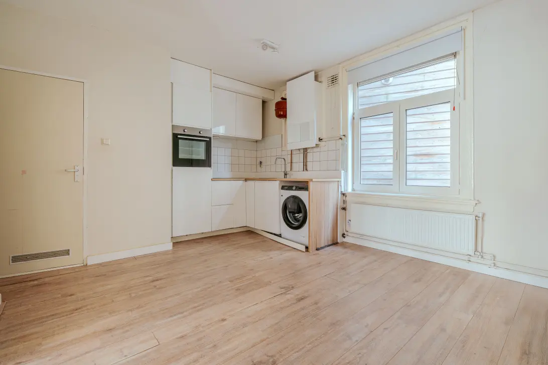 You enter on the first floor, where you are welcomed into a playful kamer-en-suite layout. At the rear is the living room with an open kitchen equipped with built-in appliances. The en suite doors lead to the atmospheric front room, which can serve perfectly as a bedroom or workspace. The compact bathroom is fitted with a shower and toilet.
