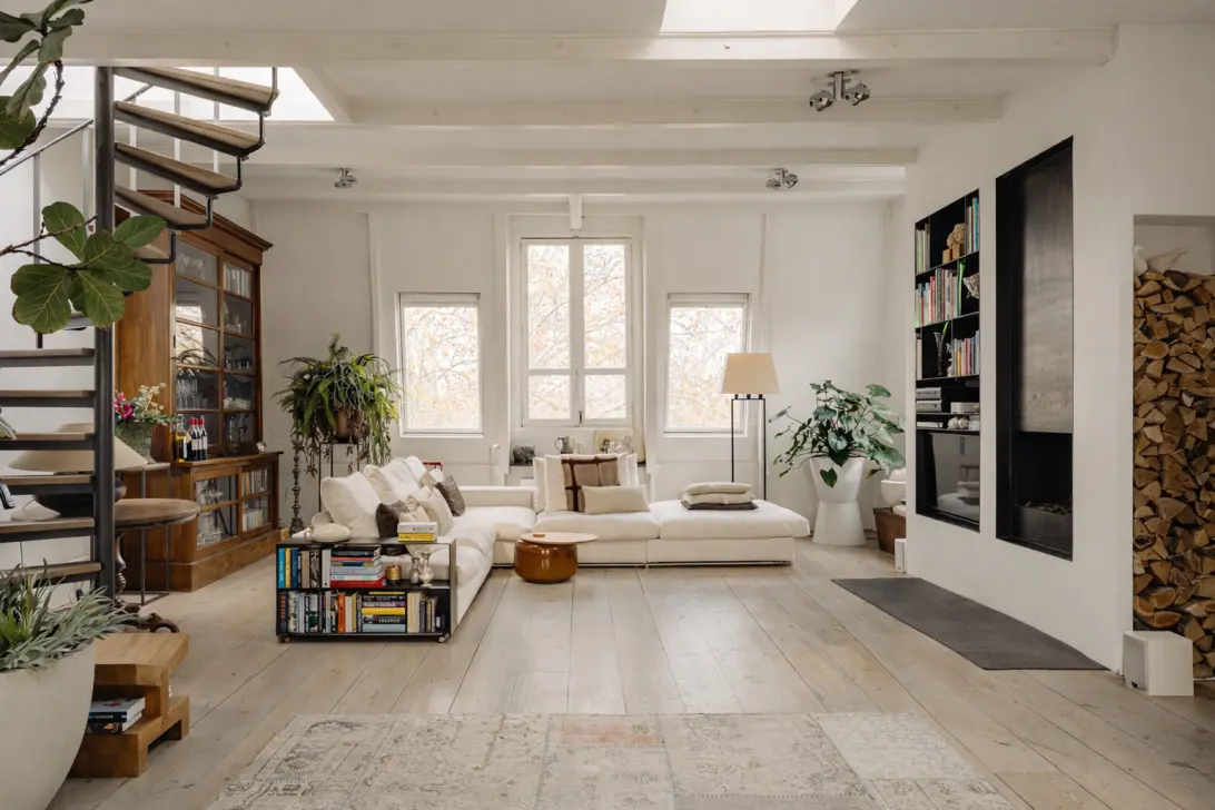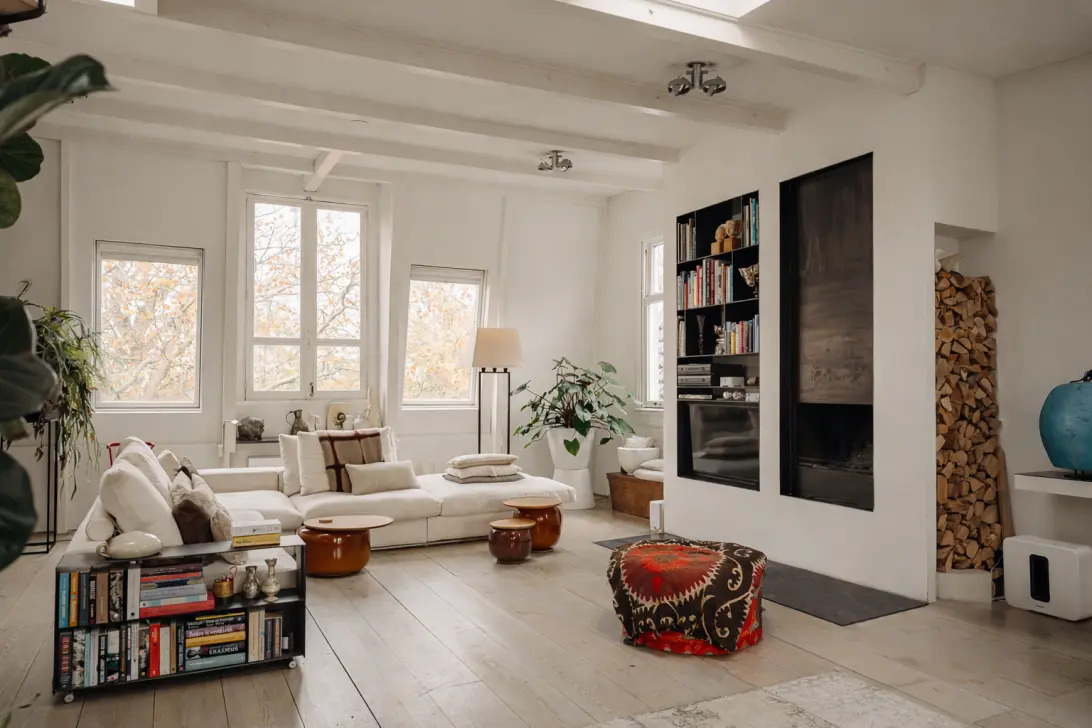 “Door een aantal verbouwingen hebben we dat loftgevoel in de loop van de jaren kunnen versterken. De stoere stalen, plafondhoge open haard is een van de ingrepen die wat dat betreft nog steeds een wow-gevoel oproepen. Heerlijk aan dit huis zijn ook de vele ruime kamers, of we er nu slapen, werken, of muziek maken.”