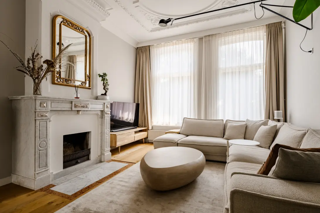 De ruime woonkamer heeft originele ornamenten in het plafond en een indrukwekkende, originele marmeren schouw. Het zitgedeelte bevindt zich aan de voorzijde van de woning en is voorzien van grote raampartijen met prachtig uitzicht over het Sarphatipark. De openslaande deuren aan de achterzijde van de woning bieden toegang tot de ruime en rustgevende achtertuin.