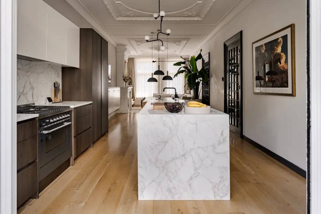 Op de begane grond bevindt zich het eetgedeelte met hangkasten, grenzend aan de ruime woonkeuken. De volledig op maat gemaakte keuken van de chef-kok is een lust voor het oog en beschikt over gerookte eiken kasten en een elegant eiland van Calacatta-marmer.