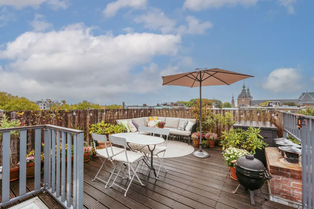 De vaste trap leidt naar het unieke dakterras van ca. 26 m², een ware oase midden in de stad. Dit zonnige terras biedt voldoende ruimte voor zowel een eettafel als een loungehoek en is omgeven door groen. Hier kunt u genieten van privacy, rust en breed uitzicht over Amsterdam.