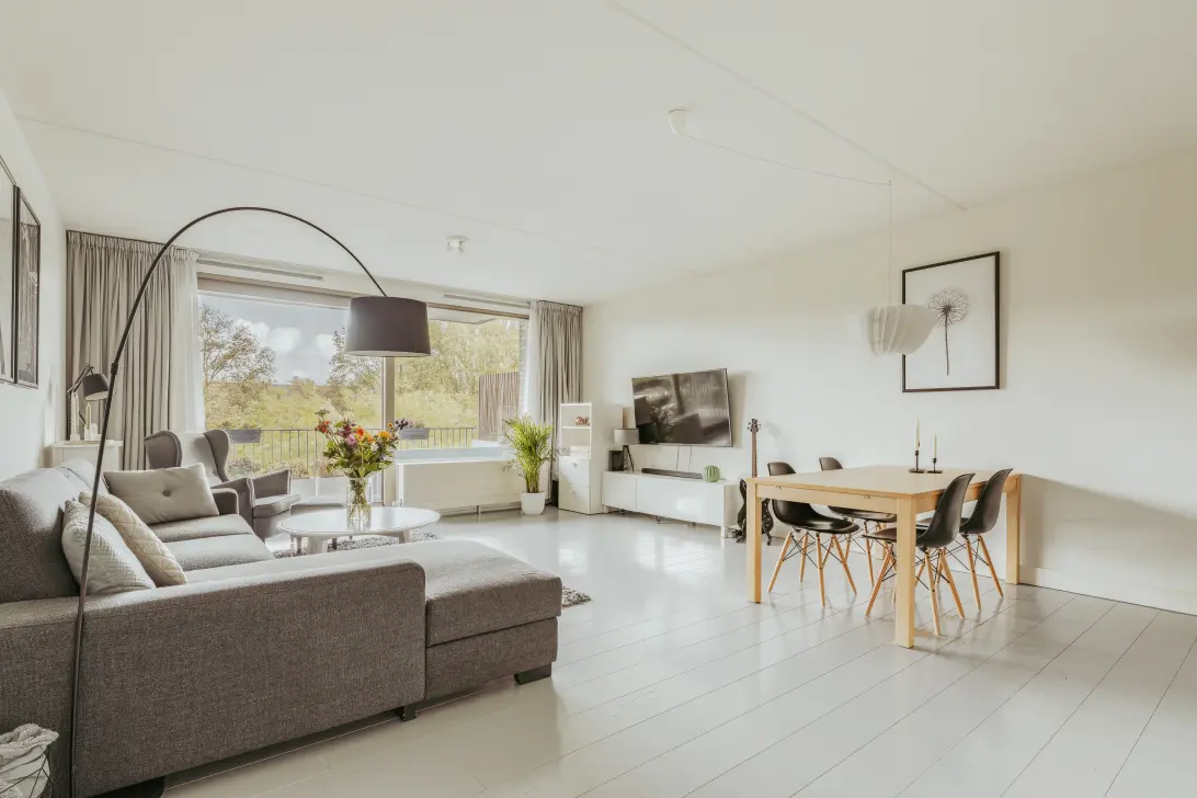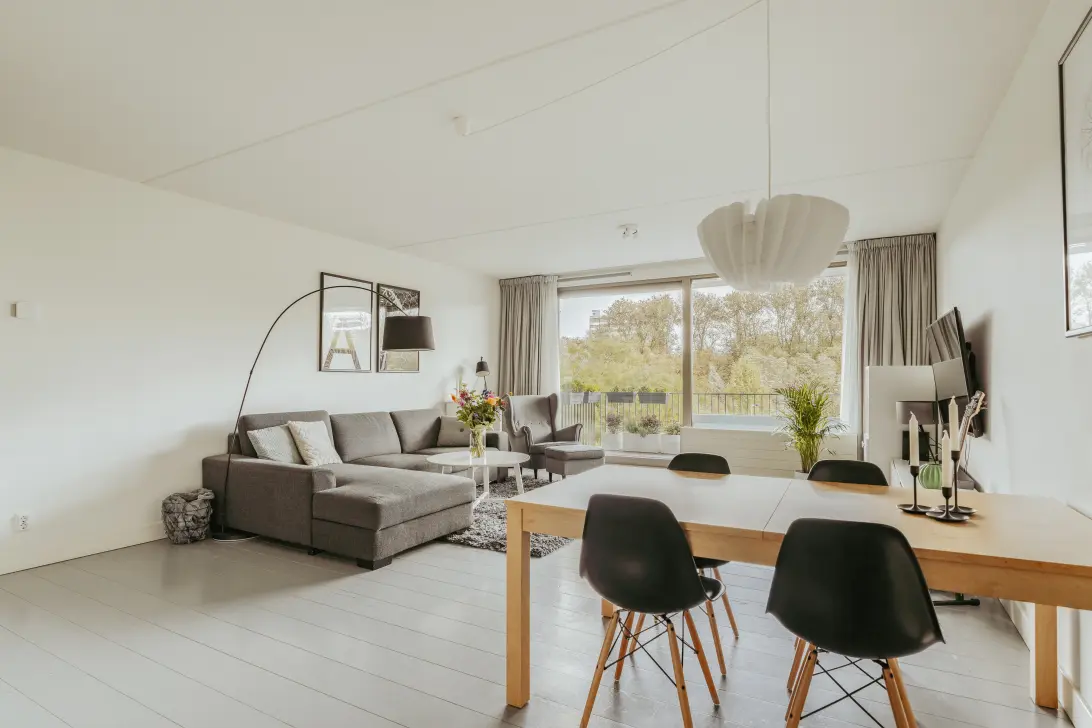 The living room is spacious, with a wide sliding door that opens to a view of a part of the Rembrandt Park. This window not only lets in plenty of daylight but also enhances the open and calm atmosphere of the home. The semi-open kitchen logically connects to this space and is equipped with an induction cooktop, dishwasher, oven, and fridge-freezer.