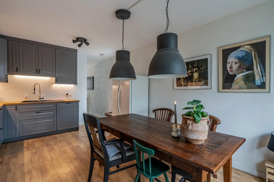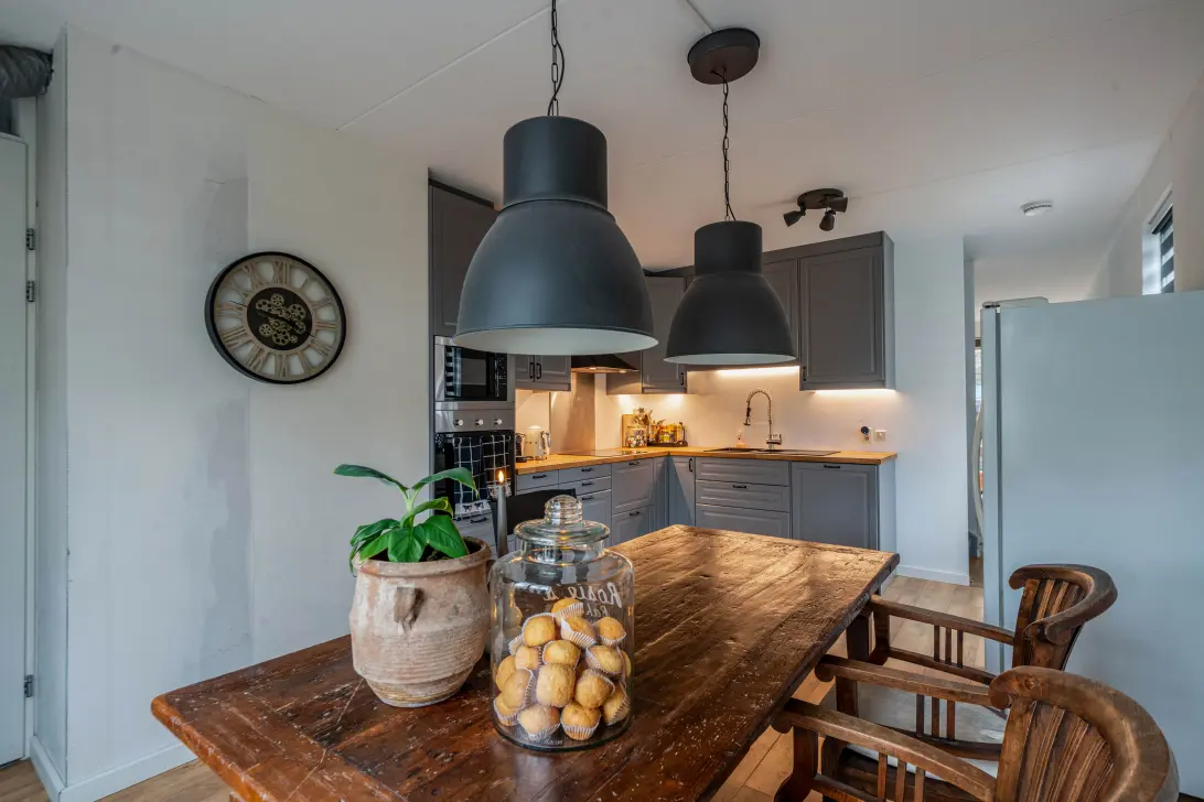 Aan de voorzijde van de woning bevindt zich de ruime woonkeuken. De keuken is opgesteld in een praktische hoekopstelling en biedt veel opbergruimte dankzij de vele boven- en onderkasten. De keuken is voorzien van diverse inbouwapparatuur, waaronder een inductiekookplaat met afzuigkap, oven, magnetron en vaatwasser. Daarnaast is er een losse koel-/vriescombinatie. Door de royale opzet is er voldoende plek voor een grote eettafel – ideaal voor gezellige diners of lange avonden met familie en vrienden.