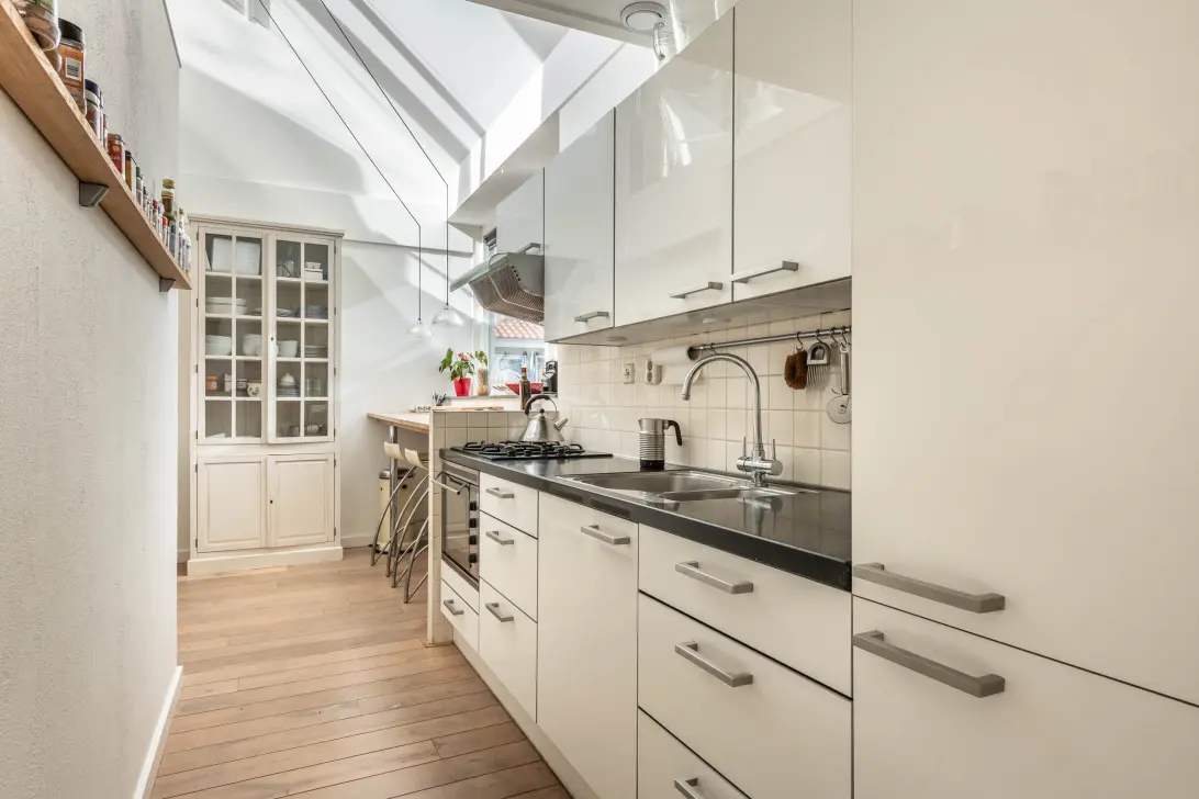 De naastgelegen keuken is netjes en kenmerkt zich door veel licht en ruimte. De keuken is goed onderhouden en voorzien van divers inbouwapparatuur, zoals een 4-pits gasfornuis, koelkast met vriesvak en veel berg- en werkruimte. Het plafond reikt tot en met de 2e etage, waardoor de ruimte van weerskanten een prachtige lichtinval heeft.