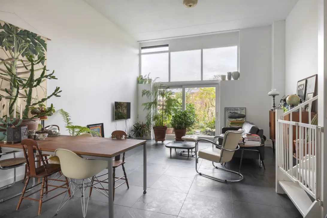 Op de tussenverdieping is een zeer ruime, multifunctionele kamer met een dakterras. Nu is deze kamer in gebruik als werkkamer/hobbyruimte, maar een invulling als tv-kamer of speelkamer van de kinderen is goed mogelijk. Aan de voorzijde kijk je naar het hofje en aan de andere zijde naar de woonkamer, de tuin én naar het water!
