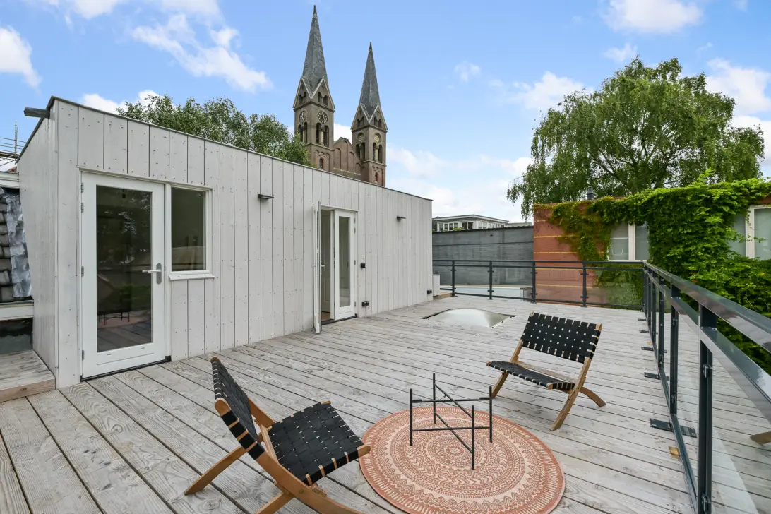 Het royale dakterras met een terras van houten planken is ruim en biedt veel mogelijkheden. Kies jij voor een afwerking in Ibiza-stijl? Of hou jij meer van modern? Er is in ieder geval volop ruimte voor meerdere zitjes, planten of struiken in de grote houten vaste plantenbakken en een grote eettafel.