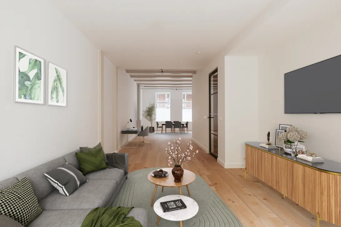 Stap binnen in de verrassend ruime en speels gevormde living. Dit wordt zeker één van jouw lievelingsplekken. De gelhaard en het lichtgrijze balkenplafond zijn leuke details die de sfeer maken. Zowel aan de voor- als aan de achterzijde heb je ruimte voor een zithoek. Of kies je aan de voorzijde voor een zithoek en een eethoek? Een schuifwand aan de achterzijde geeft toegang tot de knusse patio-tuin.