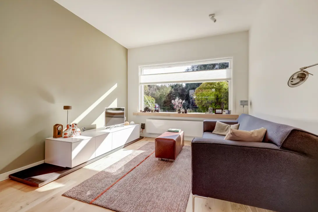 De woonkamer is aan de voorzijde van de woning gelegen en biedt uitzicht op de verzorgde voortuin. Aan de achterzijde bevindt zich de eetkamer, die in open verbinding staat met de keuken.