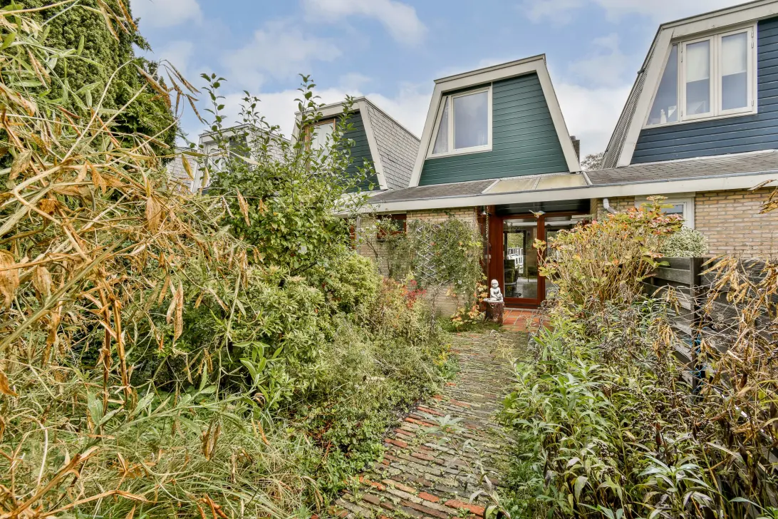 De toegang tot het perceel bevindt zich aan het straatje waar ook de auto geparkeerd kan worden. Via de eigen toegangsdeur bereikt u het perceel. Hier vindt u een praktische fietsenberging en een ruime, beschutte tuin op het westen — een heerlijke plek om in de middag- en avondzon te genieten. Vanuit de tuin is er toegang tot de entree van de woning.