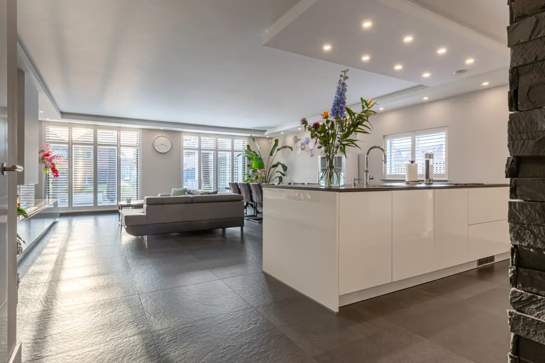 Via de hal betreed je de zeer royale woonkamer met open keuken. De woonkamer heeft een oppervlakte van circa 62 m² en is opvallend licht dankzij het zijraam en de twee grote schuifpuien richting de tuin. De begane grond is voorzien van comfortabele vloerverwarming en strak gestucte wanden. Er is meer dan voldoende ruimte voor een grote zithoek en een royale eettafel voor maar liefst tien personen. De sfeervolle haard zorgt voor extra warmte en gezelligheid en maakt deze leefruimte compleet.