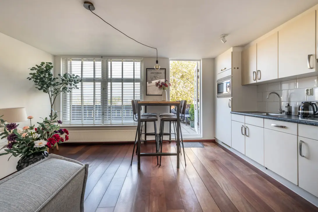 De woonkamer is ruim opgezet, biedt direct toegang tot het ruime dakterras op het Westen en heeft door de ligging, de hoeveelheid raampartijen en de aanwezigheid van een lichtkoepel boven het woongedeelte veel lichtinval, waardoor het appartement als zeer licht wordt ervaren. Het appartement is voorzien van een open keuken, een keurige houten vloer en isolerende beglazing.