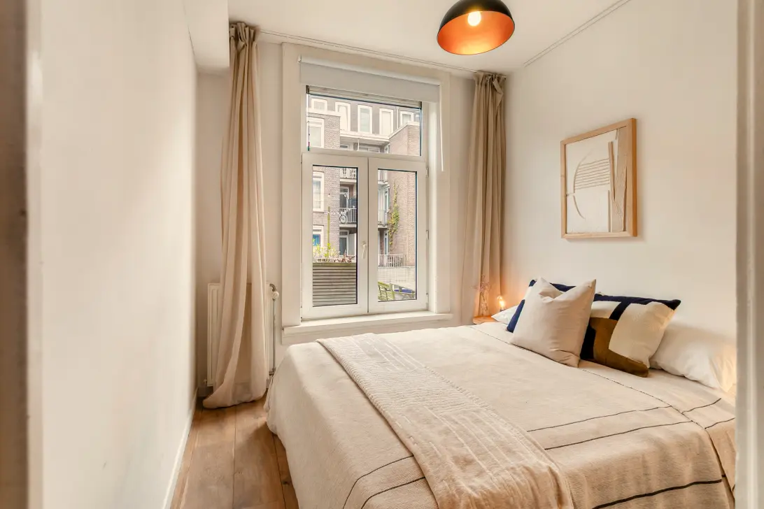 Aan de achterzijde bevindt zich de master bedroom. Deze is van uitstekend formaat en biedt ruimte voor een groot tweepersoonsbed. Daarbij vind je hier een ruime inbouwkast. Het raam zorgt niet alleen voor een goede hoeveelheid lichtinval, maar ook voor een gezellig uitzicht over de binnentuinen.