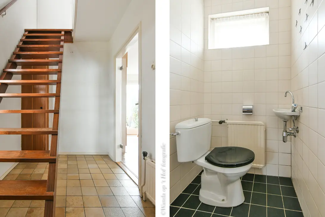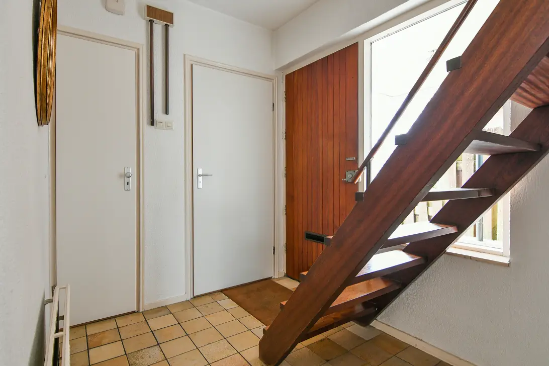 Entree met hal, meterkast, trapopgang, toilet en opbergruimte. Vanuit de hal toegang tot de woonkamer.