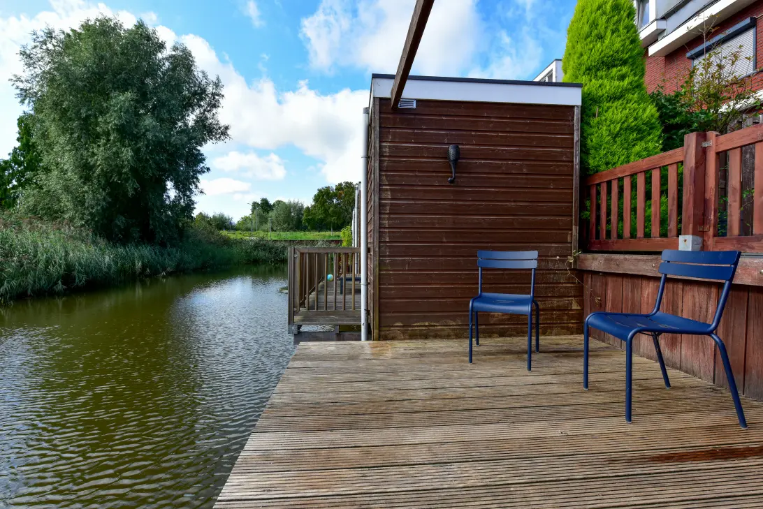 The rear garden faces southeast and consists of two levels. The first part borders the house and is separated by a small fence from the lower level, making it safe for young children. Via a few steps, you reach the second level: a spacious decked terrace by the water, including a private storage shed. Thanks to the green strip across the water, you enjoy an unobstructed and green view without direct rear neighbors.